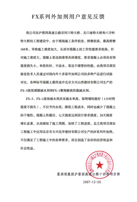 葛洲壩集團(tuán)滬蓉西高速公路14標(biāo)項目部雙河口特大橋八字嶺特大橋FX-3緩凝高效減水劑960噸 FX-1聚羧酸高效減水劑538噸