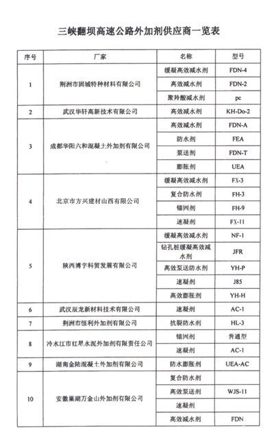 中鐵十一局翻壩高速公路3標項目部FX-11速凝劑2100噸FH-3復合防水劑490噸